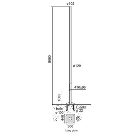 Palo cilindrico realizzato in acciaio zincato a caldo 70 micron, come da normativa UNI EN ISO 1461 (EN 40-5), con successivo trattamento superficiale di verniciatura acrilica a polvere texturizzata (grigio/nero). Il palo è costituito da un unico tubo saldato con all’estremità superiore un codolo cilindrico ø102mm L=106mm; è in acciaio EN10025S355JR (ex Fe510 UNI7070), ha diametro 120 mm, spessore 3 mm e altezza 8000 mm. L'asola per la portella è dimensiona a 410x95 mm, ad altezza 1000 mm dal terreno, idonea per il montaggio della morsettiera ad un fusibile (cod. 1862) o a due fusibili (cod. 1865/1863). Il palo permette l'installazione di morsettiere italiane/francesi/spagnole, inglesi (con adattatore in legno da ordinare separatamente) e tedesce/svizzere (con guida DIN da ordinare separatamente). Portella realizzata a filo, in fusione di alluminio; ad essa è correlata la relativa chiave, triangolare grande (9 mm lato chiave) per portella (cod. 0246). La chiusura è assicurata tramite una guarnizione di tenuta antinvecchiante che si adatta alle irregolarità superficiali del palo. La portella è montata per mezzo di una contropiastra, fissata all'interno al palo tramite saldatura a punti. Internamente al palo è saldato un gancio metallico, atto a supportare la morsettiera. Esso è costituito da un tondino metallico, di diametro 4 mm, ripiegato due volte, di dimensioni 40x26 mm. La piastra di ancoraggio per il supporto del palo è in acciaio EN 10025-S235JR (ex Fe 360 UNI 7070) zincato a caldo 70 micron, come da normativa UNI EN ISO 1461 (EN 40-5); ha geometria quadrata, con 4 smussi 40x45°, dimensioni 400x400 mm e spessore 20 mm. Le 4 asole di dimensione 67x30 mm, con interasse di 300x300 mm, permettono il passaggio dei tirafondi di fissaggio. Il palo è assicurato alla piastra tramite saldatura alla base, inoltre 4 alette di rinforzo sono saldate intorno ad esso.; I tirafondi in acciaio, lunghi 500 mm e con diametro 24 mm, sono bloccati tramite viterie in acciaio. Dimensioni (mm): ø120x8000 . Colore: Grigio (15) .