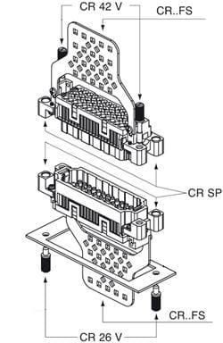 Nella parte fissa, una coppia di supporti CR SP viene montata sul connettore utilizzando le sue stesse viti di fissaggio. Sui supporti viene montato un ancoraggio CR..FS o CR..SS utilizzando le viti di fissaggio e le rondelle in dotazione. Il tutto vienebloccato al pannello dal retro con la coppia di vitoni CR 26 V. Nella parte mobile si ha ancora una coppia di supporti CR SP montata sul connettore e un ancoraggio CR..FS o CR..SS fissato su di essa. La coppia di vitoni CR 42 V consente di bloccare la parte mobile alla fissa. Nota: Svitando i vitoni a pannello CR 26 V, tutto l’assieme (parte mobile+parte fissa) può essere estratto dal pannello per ispezione.