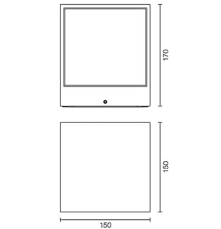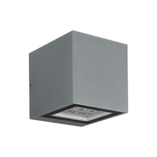 Applique da interno o esterno; 36W (9+9 LED) - 230Vac 50Hz; 3000K; CRI: 75÷85; ottiche: 30°; flusso totale: 1137 lm; corpo in alluminio pressofuso, schermo emissione in vetro temprato e serigrafato; finitura: verniciatura per esterni -grigio; temperatura di esercizio: -10°C +45°C; grado di protezione contro i liquidi e i corpi solidi: IP65; grado di resistenza all'impatto IK05; Glow Wire Test: 960°; sicurezza fotobiologica: gruppo rischio 1 secondo EN62471:2006; montaggio con viti e tasselli; classe di isolamento I; peso 3,50kg; dimensioni 150x150x170mm; collegamento 230Vac 50Hz, con cavo fornito di muffola stagna al gel per cablaggi in esterni; alimentatore integrato.