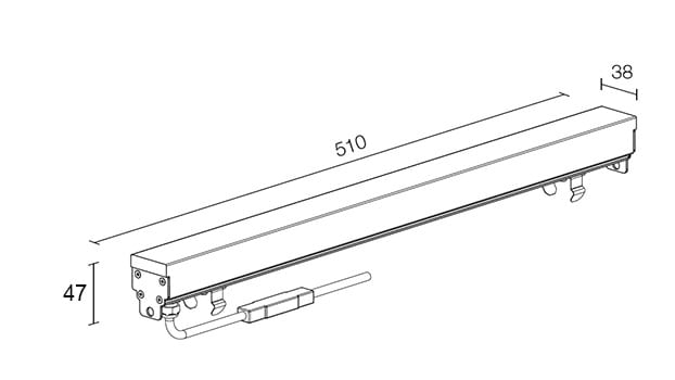 Profilo lineare da interni ed esterni; carrabile fino a 5000kg; 8W - 24 Vdc; power LED SMD; 2800K; luce diffusa; flusso totale: 336 lm/m (2800K); corpo in PMMA bianco opale estruso, testate in acciaio Inox AISI 316L e molle in AISI 301, cassaforma standard in alluminio estruso lega EN AW 6060; cassaforma in acciaio Inox disponibile; NTC controllo della temperatura a bordo; PCB tropicalizzati; temperatura di esercizio: -10°C +45°C; temperatura vetro: max 40°C (Ta 25°C); dotato di sistema IPS; grado di protezione contro i liquidi e i corpi solidi: IP67; grado di resistenza all'impatto IK10; sicurezza fotobiologica: gruppo rischio 2 secondo EN62471:2006; montaggio a incasso (parete, pavimento) con cassaforma; classe di isolamento III; peso: 1,20 kg/m; dimensioni 510x38x47mm; collegamento in parallelo; incluso 1,5 m di cavo in neoprene H05RN-F 2x0.35/0.75 Ø6.2; dimmerazione disponibile mediante utilizzo di dimmer in linea 24Vdc; accessori: cassaforma in alluminio WC8221; cassaforma per cartongesso WC8421; cassaforma in acciaio Inox WC8251; kit allineamento casseforme in alluminio WN8010, kit allineamento casseforme in acciaio inox WN8011; coppia estrattori WN8002; kit anticaduta WN8102.