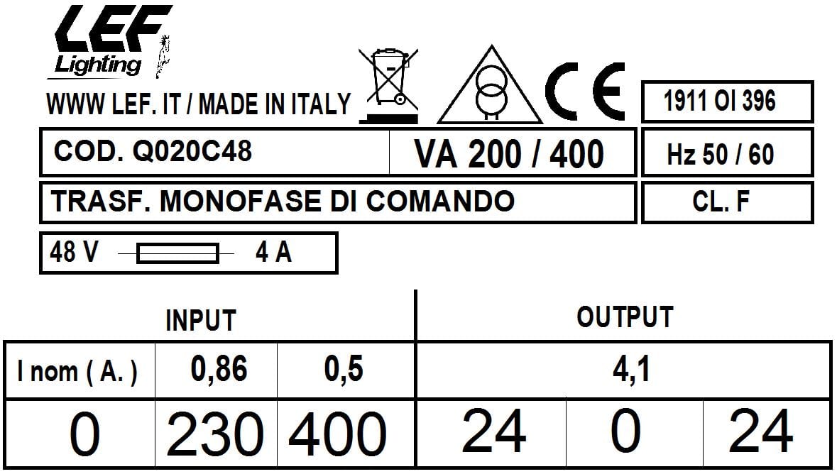 L.E.F. SRL - LEFQ020C48 T.M. 200VA 230.400V / 24.0.24V