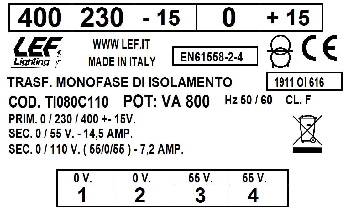 L.E.F. SRL - LEFTI080C110 T.M. 800VA 230.400V / 55?110V