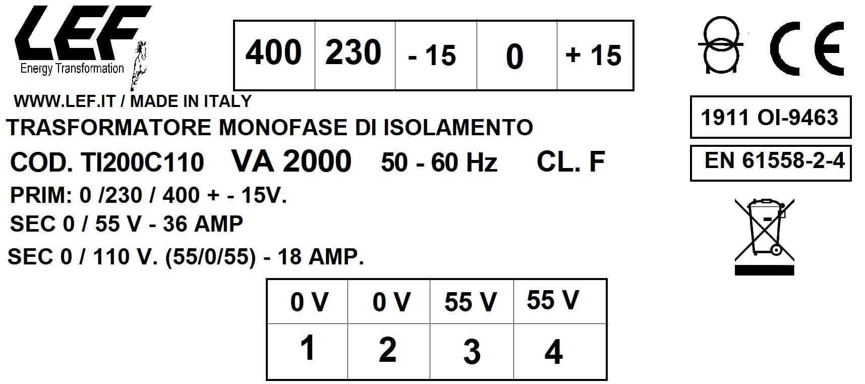 L.E.F. SRL - LEFTI200C110 T.M. 2000VA 230.400V / 55?110V
