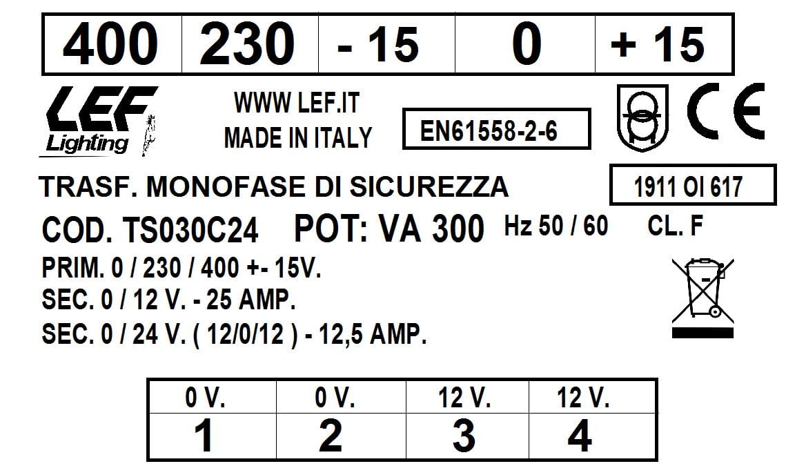 L.E.F. SRL - LEFTS030C24 T.M. 300VA 230.400V / 12?24V