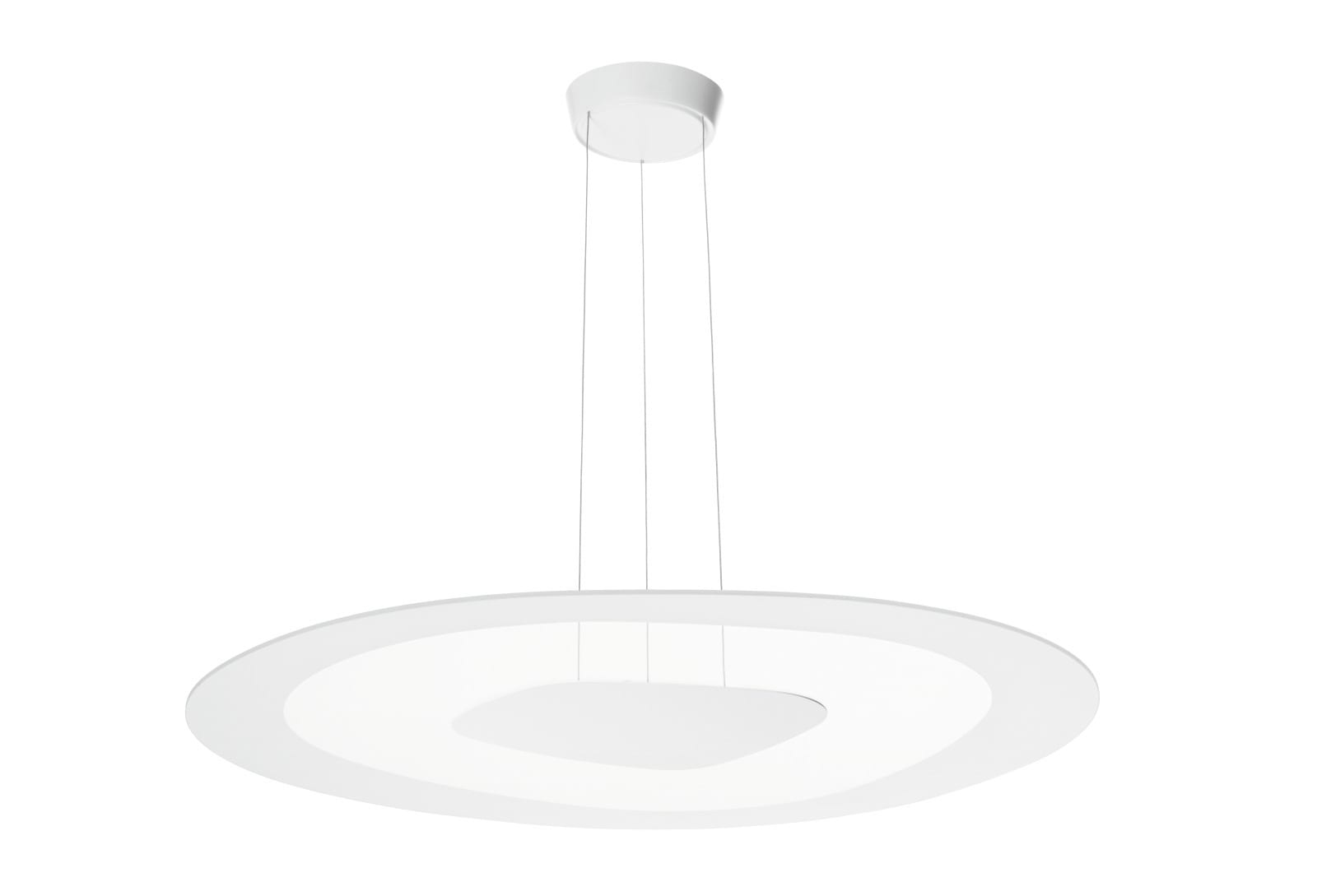 Antigua_P - Sospensione a doppia emissione per applicazione indoor. La sorgente luminosa LED, di colore bianco caldo, con distribuzione luminosa General Lighting, è composta da 48 LED stripled, con una CCT 3000 K ed un CRI 80; il flusso luminoso della sorgente è di 6479 lm, con un'efficienza nominale di 115.7 lm/W. Il corpo dell'apparecchio, realizzato in ferro, presenta una finitura di colore bianco ral 9003 goffrato, ottenuta tramite verniciatura; il diffusore è prodotto in vetro, con una lavorazione di sabbiatura; la montatura è prodotta in ferro, con una finitura di colore bianco ral 9003 goffrato, ottenuta tramite verniciatura. Il grado di protezione è IP20; La potenza assorbita dall'apparecchio è di 56 W. L'apparecchio presenta una classe di isolamento I ed è installabile a soffitto. Ottica: 180°.