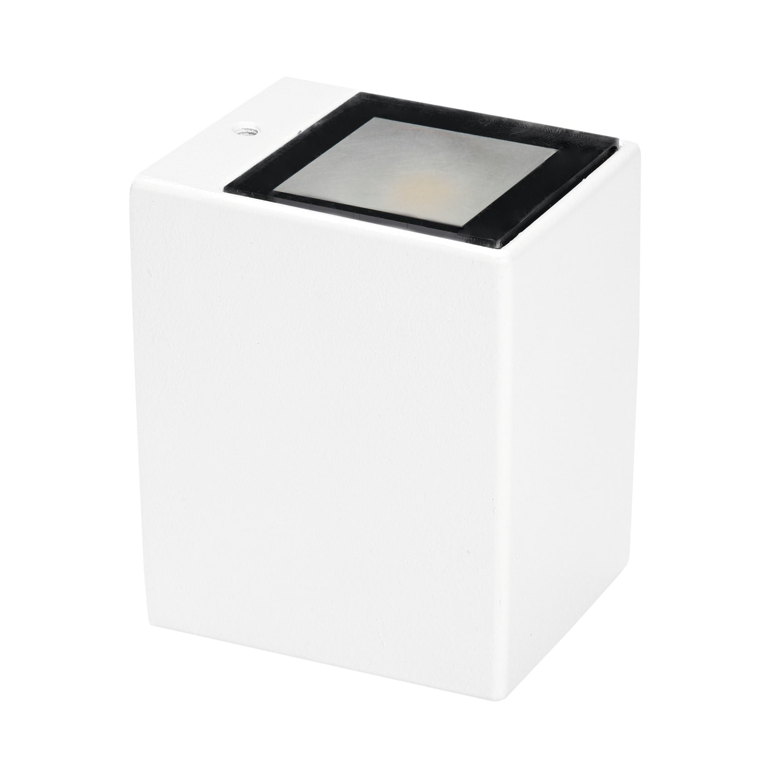 Lampada a parete a singola emissione per applicazione outdoor. La sorgente luminosa LED, di colore bianco caldo, con distribuzione luminosa General Lighting, è composta da 1 LED powerled, con una CCT 3000 K ed un CRI 80; il flusso luminoso della sorgente è di 490 lm, con un'efficienza nominale di 119.5 lm/W.