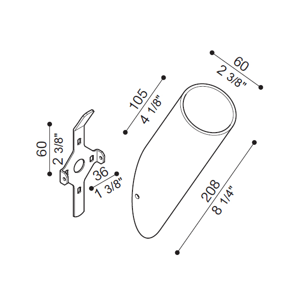 Braccetto Line/Line Down. Braccetto diametro 60 mm in Bayblend. Completo di kit di fissaggio a parete. Inclinazione 30°. Colore nero.