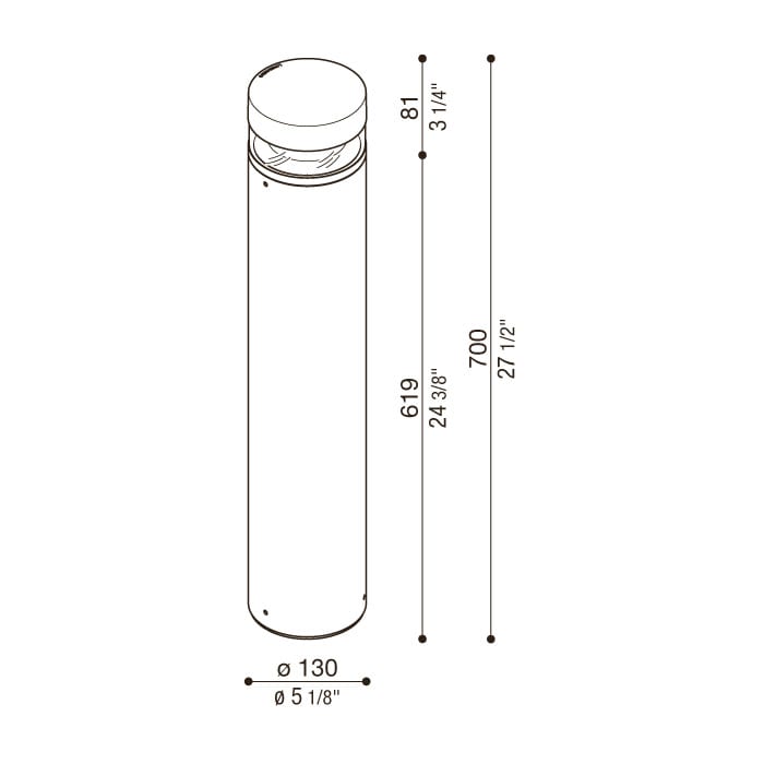 Tok H700 - Adatto anche ad uso esterno. Corpo e testa in alluminio; elevata resistenza all’ossidazione grazie al trattamento di cataforesi, e alla verniciatura con resine poliestere stabilizzata ai raggi UV. Completo di staffa di fissaggio in tecnopolimero. Predisposto per installazione rapida su palo Ø 60 standard. Tirafondi e minuteria per ancoraggio del palo al terreno incluso. Diffusore in PMMA trasparente antigraffio stabilizzato ai raggi UV. Bulloneria in acciaio A4 con rivestimento in materiale termoplastico. Fornito con 1m di cavo H05RN-F pre-cablato. Alimentazione diretta 220 - 240V. Nessun rischio fotobiologico, RG0 gruppo di rischio esente (EN62471). Emissione luminosa 360°. LED 13W 1860 lm 3000K. Colore: Corten.