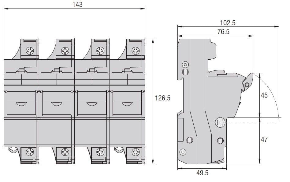 BASE PORTAFUSIBILI OMOLOGATA CURUS, PER FUSIBILI 22X58MM. CORRENTE NOMINALE 125A (690VAC), 3P+N. SENZA INDICATORE LUMINOSO. 4 MODULI