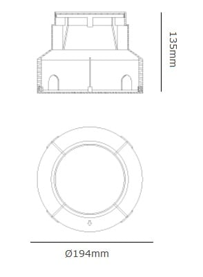 Controcassa a murare per apparecchi serie Lira 140, Corpo in tecnopolimero, Chiusura inferiore e superiore per agevolare la cementazione, Controcassa cilindrica di dimensioni Ø194mm con profondità 135mm.