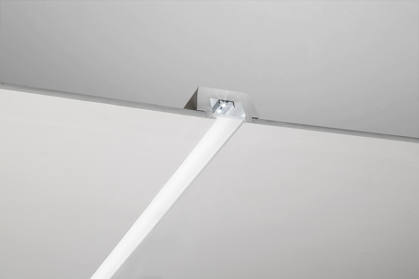 Profili lineari in gesso, realizzati in Italia con materiali naturali minerali e vegetali. Striscia LED da ordinare separatamente. Incasso a soffitto per installazione in controsoffitti di cartongesso di spessore 13mm. Elemento completo di un profilo dialluminio per l’installazione di una striscia LED e di un diffusore in pmma satinato 1mm. Chiusure laterali da effettuare durante il montaggio.