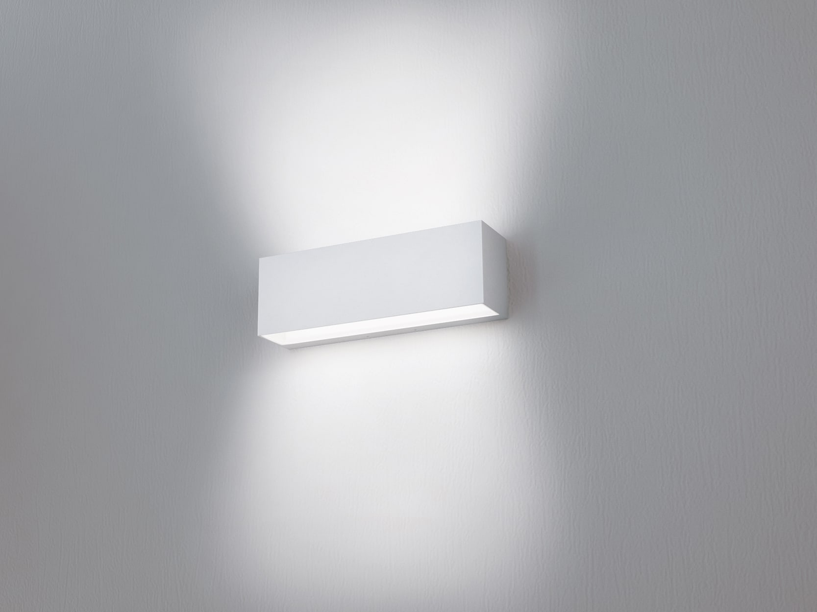Apparecchio LED per installazione a parete, con fascio bi-direzionale. LED HONGLI 2x25W 5000lm 4000K 80°x60° CRI80. Life time 36.000h (rendimento 70%). Corpo in alluminio pressofuso a basso contenuto di rame, verniciato bianco. L'apparecchio è dotato di base di fissaggio a parete pre cablata con morsetti ad innesto rapido. Vetro trasparente con diffusore microprismatico. Guarnizioni in silicone. Viti in acciaio Inox. Scheda LED dimmerabile a tensione di rete 220-240V. IP65 Classe I.