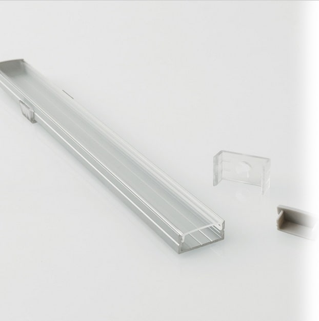 Profilo in alluminio da superficie per striscia LED con diffusore trasparente di 2m. Tappi e clip di fissaggio inclusi.