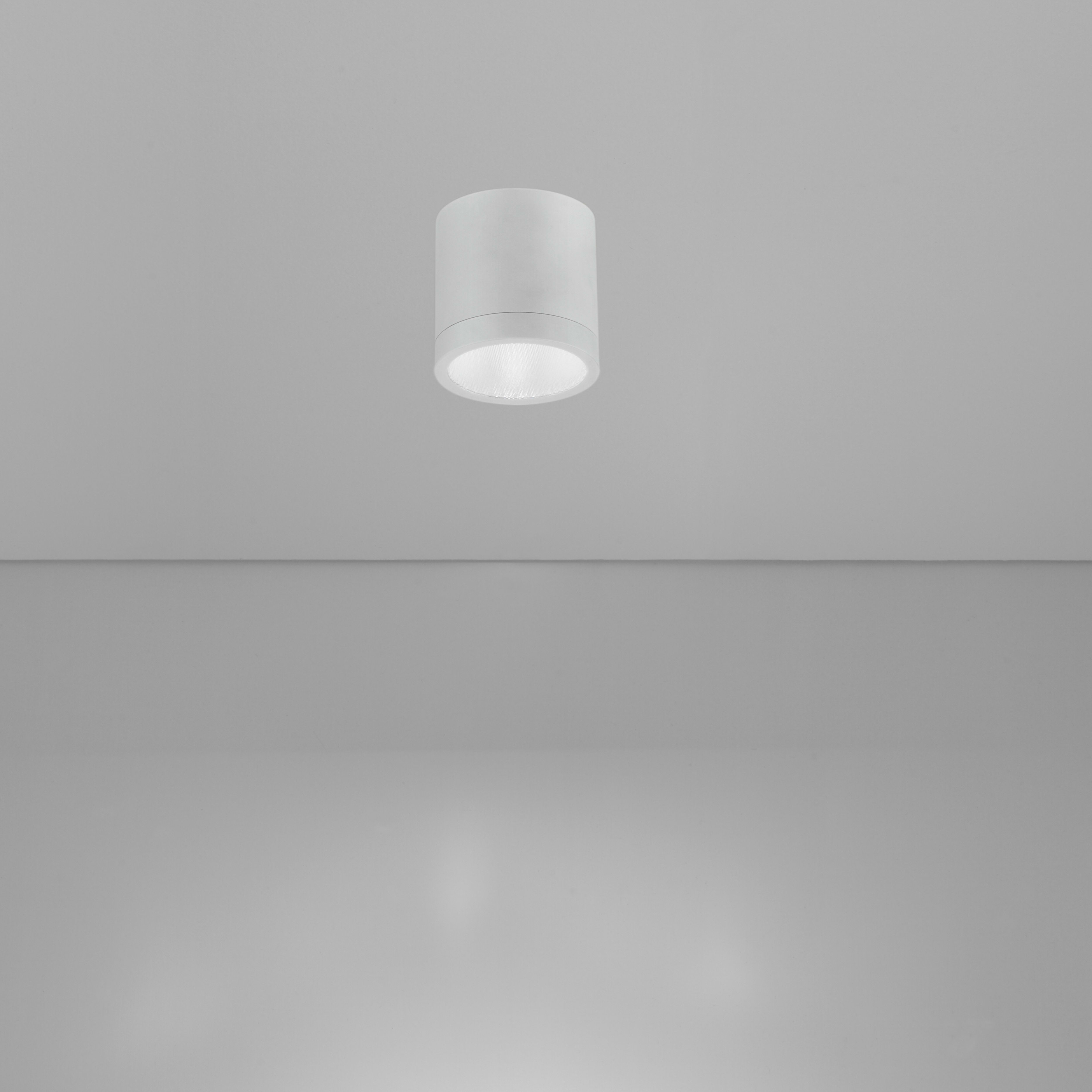 Apparecchio LED a plafone per installazione a soffitto. Corpo: in alluminio verniciato bianco. Diffusore: microprismatico. Sorgente LED Lumens AC 10W 970Lm 3000K 40°.