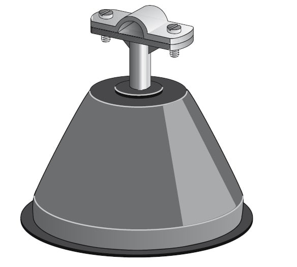In cemento con rivestimento in plastica. Per tondo Ø 8 ÷ 10 mm. Dimensioni: base Ø 140 mm, altezza 100 mm.