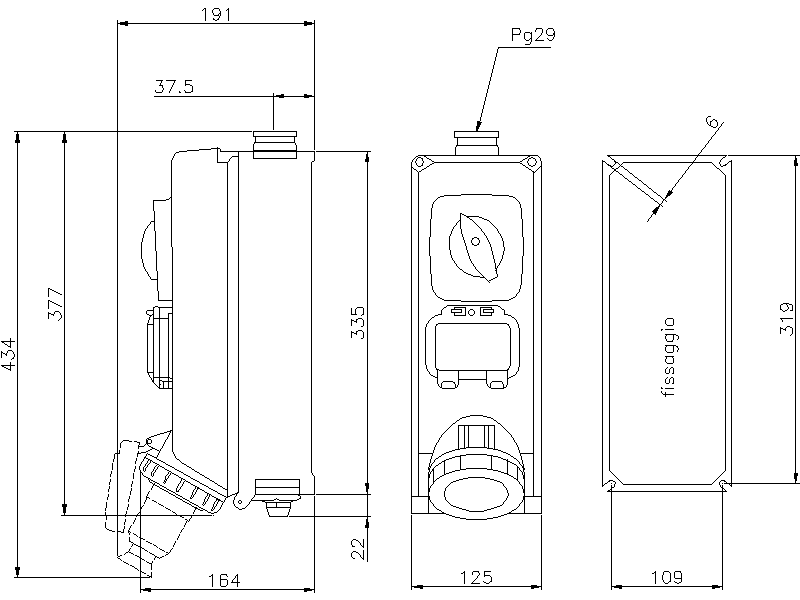 Presa da parete con interruttore di blocco e guida EN50022, sportello trasparente, in contenitore modulare isolante termoindurente. IP67 >IK10. Vano da 4 moduli EN50022. Ingresso M25. Predisposta per l'ingresso dal basso.