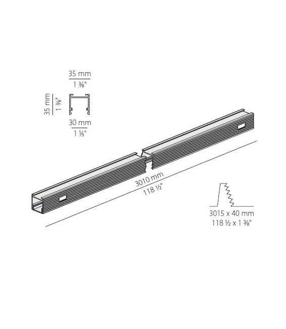 Profilo componibile per installazione incassata a soffitto o parete in ambienti interni, con emissione diretta. Struttura a scomparsa per l'incasso in cartongesso, in alluminio estruso con verniciatura a polvere in colore bianco RAL 9003. Schermo diffusore in policarbonato estruso con finitura opalina. Fornito completo di schermo monouso per rasatura, stuccatura e verniciatura della superficie di installazione. Moduli luminosi e alimentatore da ordinare separatamente. Accessori di fissaggio, giunzione e chiusura da ordinare separatamente. Dimensione del foro di incasso: 3015x40mm (40x1,6"). Sorgente luminosa LED. Distribuzione luminosa fascio diffuso. Alimentazione 24V DC. Driver remoto non incluso. Peso 0,8300Kg. Grado di protezione IP40.