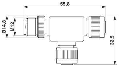 Distributore a T, 5-poli, Maschio diritto M12, codifica A, su Femmina diritto M12, codifica A, PIN 2+4 ponticellati e Femmina diritto M12, codifica A, PIN 2+4 ponticellati