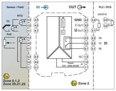 Ingresso per termoresistenze, termocoppie, trasduttori di resistenza, potenziometri e sorgenti mV, [Ex ia] IIC. Programmazione durante il funzionamento, in caso di circuito di misura Ex collegato e anche in assenza di tensione grazie all'adattatore di programmazione IFS-USB-PROG-ADAPTER. Compensazione punto freddo con connettore separato.