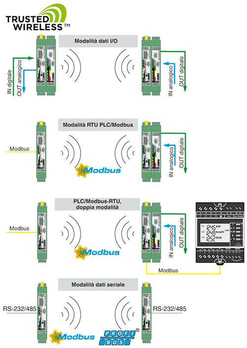 Particolarmente adatto alla trasmissione di segnali non critica in termini di tempo, sulle lunghe distanze con ostacoli. Più chilometri di portata mediante velocità dati regolabile dell'interfaccia radio. Messa in servizio semplice e rapida senza programmazione. Elevata affidabilità grazie alla tecnologia Trusted Wireless 2.0 (cifratura AES, metodo a salto di frequenza e gestione della coesistenza). Reti Mesh fino a 99 utenze. Interfaccia integrata RS-232/RS-485. Ampliabile con un massimo di 32 moduli diespansione I/O. Range di temperatura esteso da -40 °C .... +70 °C.