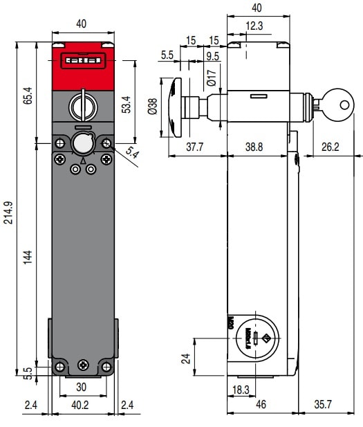 Interruttore di sicurezza con elettromagnete ad azionatore separato. Grado di protezione: IP67 secondo EN 60529 con pressacavo avente grado di protezione uguale o superiore. Modalità lavoro: Principio D, azionatore bloccato ad elettromagnete diseccitato.Custodia: Custodia in metallo, tre entrate cavi filettate M 20x1,5. Unità di contatto: 1NO+1NC mossi dall'azionatore e 1NO+1NC mossi dall'elettromagnete. Testa: Testa orientabile con sblocco a serratura e pulsante antipanico. Lunghezza pulsante di sblocco: regolabile per pareti con spessore da 60 mm a 500 mm. Alimentazione: 24 Vac/dc. LED: 2 LED verdi accesi dall'alimentazione dell'elettromagnete. Azionatore: Senza azionatore. Apertura positiva: Sì