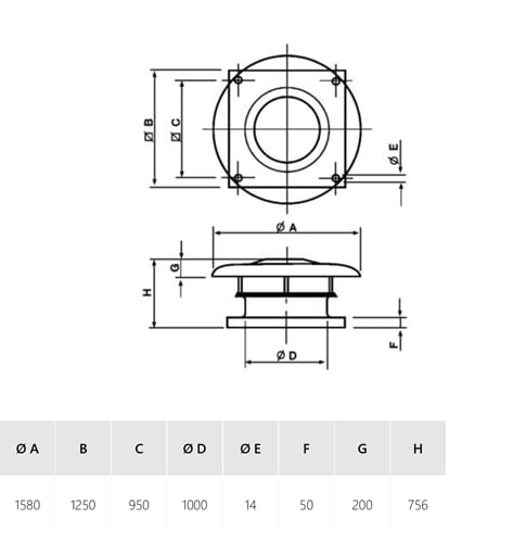 Ventilatore elicoidale da tetto in estrazione con mozzo centrale di alluminio e pale di plastica+fibra di vetro, cappello di alluminio e base in acciaio galvanizzato, motore trifase - IP55 , marca S&P modello HCTT/8-1000-B 0,75KW (230/400V50HZ) VE .