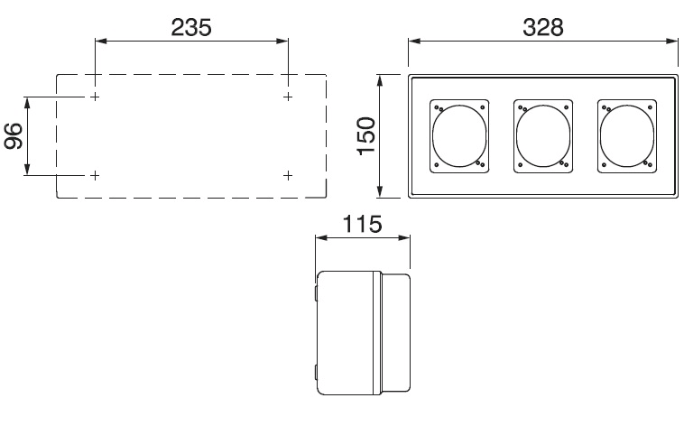 Contenitore modulare in tecnopolimero grigio RAL7035 IP66. Adatto per: n°3 prese 16A (70x87 mm) con opportuno adattamento anche 32A (84x106 mm)