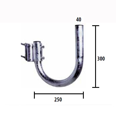Staffa da palo in acciaio S235 JRH (UNI EN 10219), zincato a caldo secondo UNI EN ISO 1461. Curvatura a 180°. 300x250x40mm.