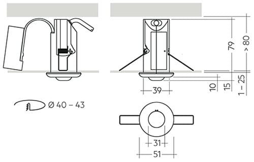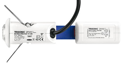 EM R2A BASIC NM 132 2W - Modulo LED per luce di emergenza, installazione diretta in soffitti. Set completo di elettronica, modulo LED, dissipatore, ottica e accumulatore. Contiene ottica multi-lenti click-in per illuminazione antipanico, di vie di fuga epresidi. Funzione luce di emergenza per test manuale. Foro soffitto ridotto, 40 – 43 mm di diametro, 80 mm di altezza. Po­ten­za d'uscita 0,75 – 1,50 W. Consumi minimi in standby. Varianti per circuito permanente e in emergenza. 3 h di autonomia misurata (varianti separate). Plug-in accumulatore litio-ferro-fosfato con pressacavi. 5 anni di garanzia sull'elettronica (driver LED). 3 anni di garanzia sugli accumulatori. IP20/IK03. LED 2W 6500K.