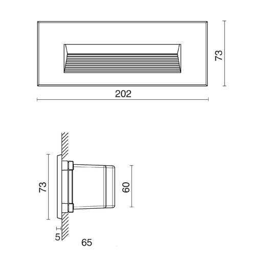 installazione: Incasso a Parete. foro incasso: Foro di incasso 215 x 85 mm. fissaggio: Molle in acciaio. corpo / struttura: Corpo in pressofusione di alluminio. verniciatura: Verniciatura in polveri di poliestere con trattamento speciale per esterni, indicata per installazioni in ambiente marino o ad alta salinità. colore: Grigio. equipaggiamento: Guarnizioni in gomma siliconica. vetro / schermo: Vetro temprato chiaro. pressacavo: n.2 passacavi in gomma siliconica PG9. alimentatore: alimentatore integrato per diodi LED, uscita stabilizzata 350mA dc. tensione: 220-240V 50/60Hz. fascio luminoso: Asimmetrico. classe isolamento: Classe 2. peso: 0,800 kg. grado IP: 65. filo incandescente: 850 °C. grado IK: 7. lampada inclusa: si. tipo LED: Power LED. potenza lampada: 5 W. flusso lampada: 450 lm. durata nominale: 50000 ore L80 B20. temperatura di colore: 3000K. indice resa cromatica: 90. costanza cromatica: 4 SDCM.