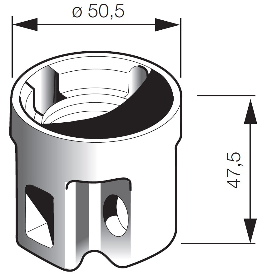Portalampade E27, corpo porcellana cilindrico ø 50 mm, portavirola metallica isolata, bianco. Fori di fissaggio ø 4,5 mm interasse 38 mm