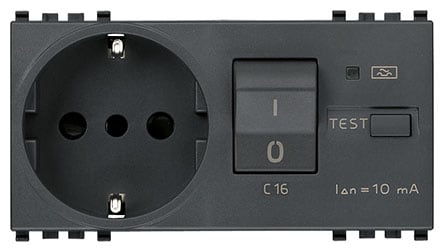 Presa SICURY 2P+T 16 A standard italiano tipo P30 (contatti di terra laterali e centrale), interbloccata con interruttore automatico magnetotermico differenziale 1P+N C 16, 230 V~ 50 Hz, I¿n 10 mA, p.i. 3000 A, grigio - 4 moduli