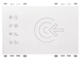 Lettore di carte a transponder per installazione all'esterno della stanza, standard KNX, 2 uscite a relè NO 4 A 24 V~, 2 ingressi, alimentazione 12-24 V~ 50-60 Hz e 12-24 V d.c. (SELV), bianco - 3 moduli. Fornito senza carta a transponder