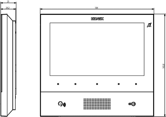 Videocitofono vivavoce da parete per sistema Due Fili Plus con display a colori LCD 7 in, tastiera capacitiva per funzioni videocitofoniche e chiamate intercomunicanti, teleloop per protesi acustiche, staffa per il fissaggio su scatola rettangolare o rotonda, bianco.