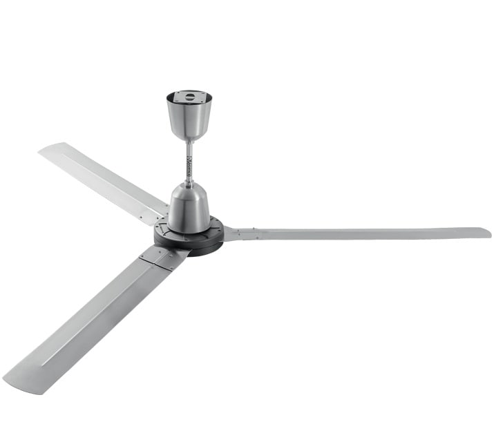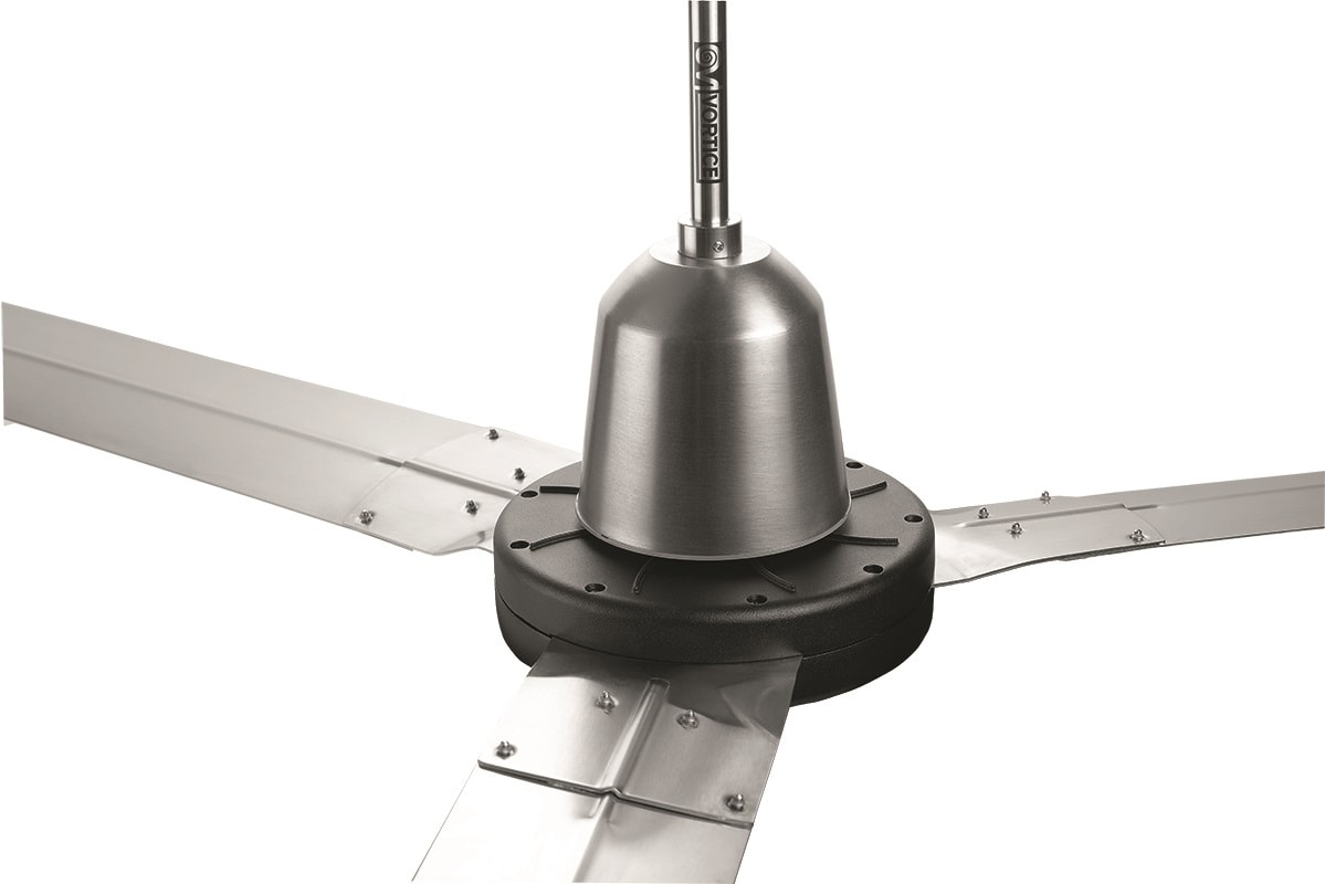 Ventilatore da soffitto industriale reversibile, serie Nordik HD. Gli apparecchi della serie Nordik HD sono ventilatori da soffitto reversibili specificamente progettati per l’utilizzo continuativo, anche alla massima velocità, in ambienti caratterizzatida concentrazione di sostanze aggressive, abrasive ed in presenza di elevati tassi di umidità. La geometria delle 3 pale, sagomate per garantire elevati valori di rigidità torsionale, permettono elevati livelli prestazionali (fino a 22.000 m³/h per i modelli 200) abbinati ad emissioni sonore contenute. I modelli BASE sono caratterizzati da pale in lamiera d’acciaio elettrozincata, trattate con fondo epossidico e successiva verniciatura epossidica in colore grigio e finitura martellata; coppe in lamiera d’acciaio elettrozincata, trattate con fondo epossidico e successiva verniciatura epossidica in colore nero e finitura martellata. I modelli INOX si contraddistinguono dai modelli base per le pale in lamiera d’acciaio inossidabile AISI 304 con finitura scotch brite; le aste e le coppe in lamiera d’acciaio inossidabile AISI 304 con finitura scotch brite; i coperchi motore verniciati con polvere epossidica in colore nero e finitura goffrata. Motore a rotore esterno ad elevato rendimento anche a bassa velocità. Funzione reversibilità: è possibile invertire la direzione del flusso d’aria dal pavimento al soffitto, si viene così a creare un flusso non più diretto, ma avvolgente e più ampio. Inoltre si migliora la destratificazione del calore in inverno, riducendo la differenza di temperatura tra il pavimento (più freddo) e il soffitto (più caldo). Dispositivo di sostegno costituito da apposita piastra, caratterizzata da 4 fori per un saldo e durevole fissaggio, compatibile con il montaggio del prodotto anche incorrispondenza di soffitti inclinati. Forniti con asta di sostegno in acciaio di 290 mm. Isolamento: Cl. I .